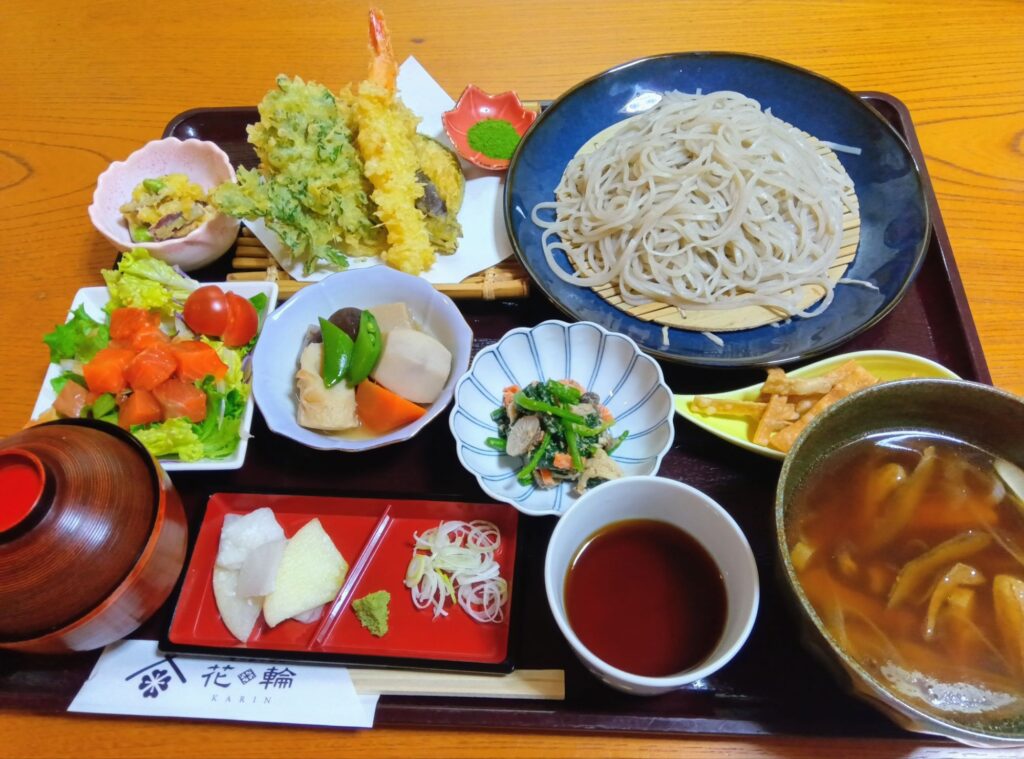 ざるそばに温かいつゆと冷たいつゆ、抹茶塩で食べる天ぷら、サーモンの入ったサラダ、煮物、ほうれん草のごま和え、さつまいもと枝豆のデザートサラダ、りんごと大根の麹漬け(?)、そばを揚げたもの(?)が並んでいました。あと、お椀の中はゆかりご飯。ふたを開けて撮れば良かった。
