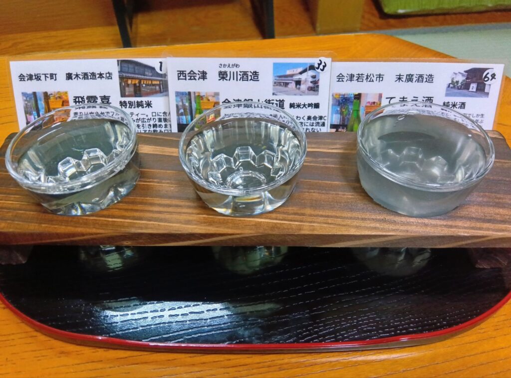地酒飲み比べセットも注文していました。廣木酒造本店の飛露喜、榮川酒造の会津銀山街道、末廣酒造のてまえ酒。フルーティーで飲みやすいお酒を揃えていただいた印象。